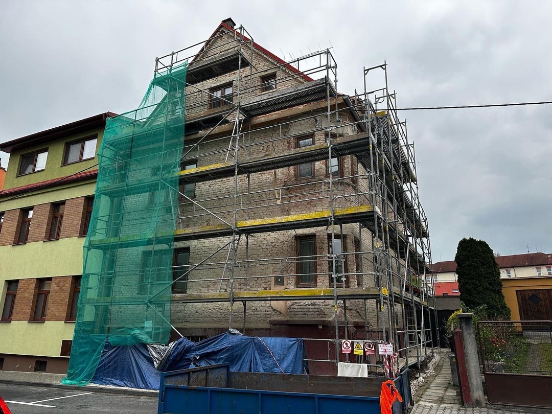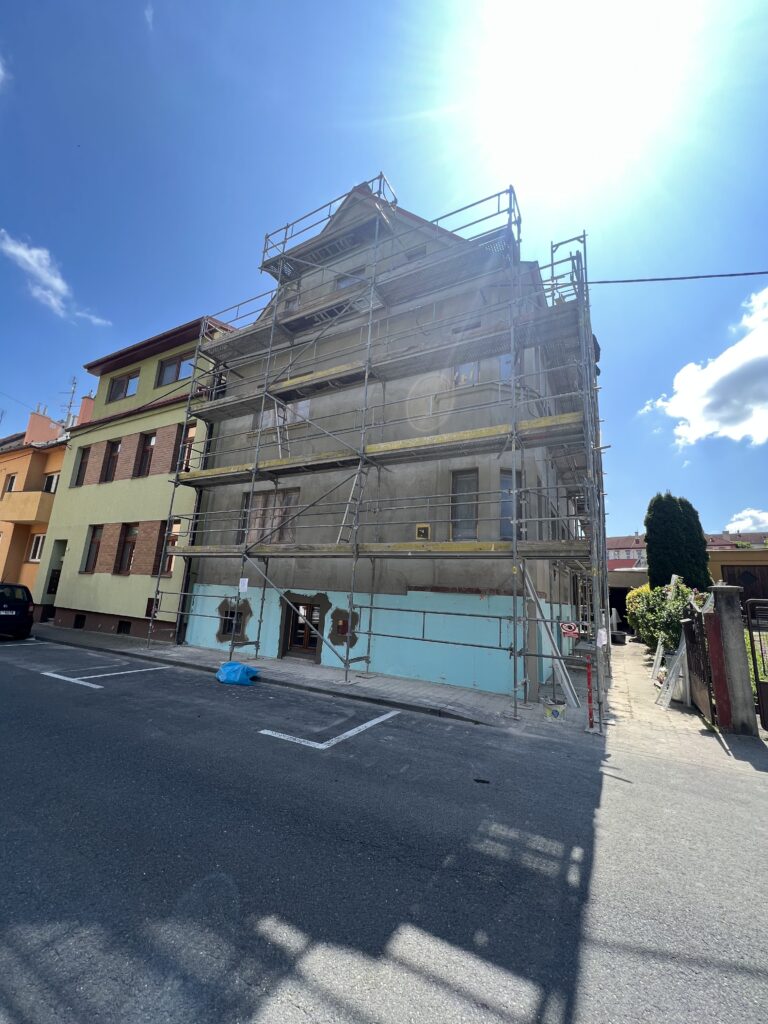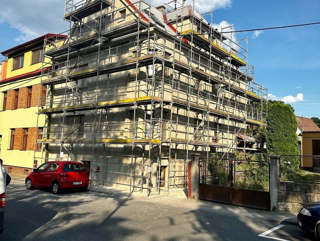 Klient nás oslovil s žádostí o renovaci fasády a výměnu klempířských prvků, které se nacházely v havarijním stavu. Klient také požadoval realizaci bez použití polystyrenu v části nad suterénem. Z tohoto důvodu jsme zvolili tepelně izolační omítku s finální fasádní omítkou od firmy Baumit. Soklová část domu byla zateplena extrudovaným polystyrenem s finální úpravou marmolitem. Mezi další požadavky klienta patřilo zachovat dobové tvary domu, což se díky zvoleným postupům podařilo.